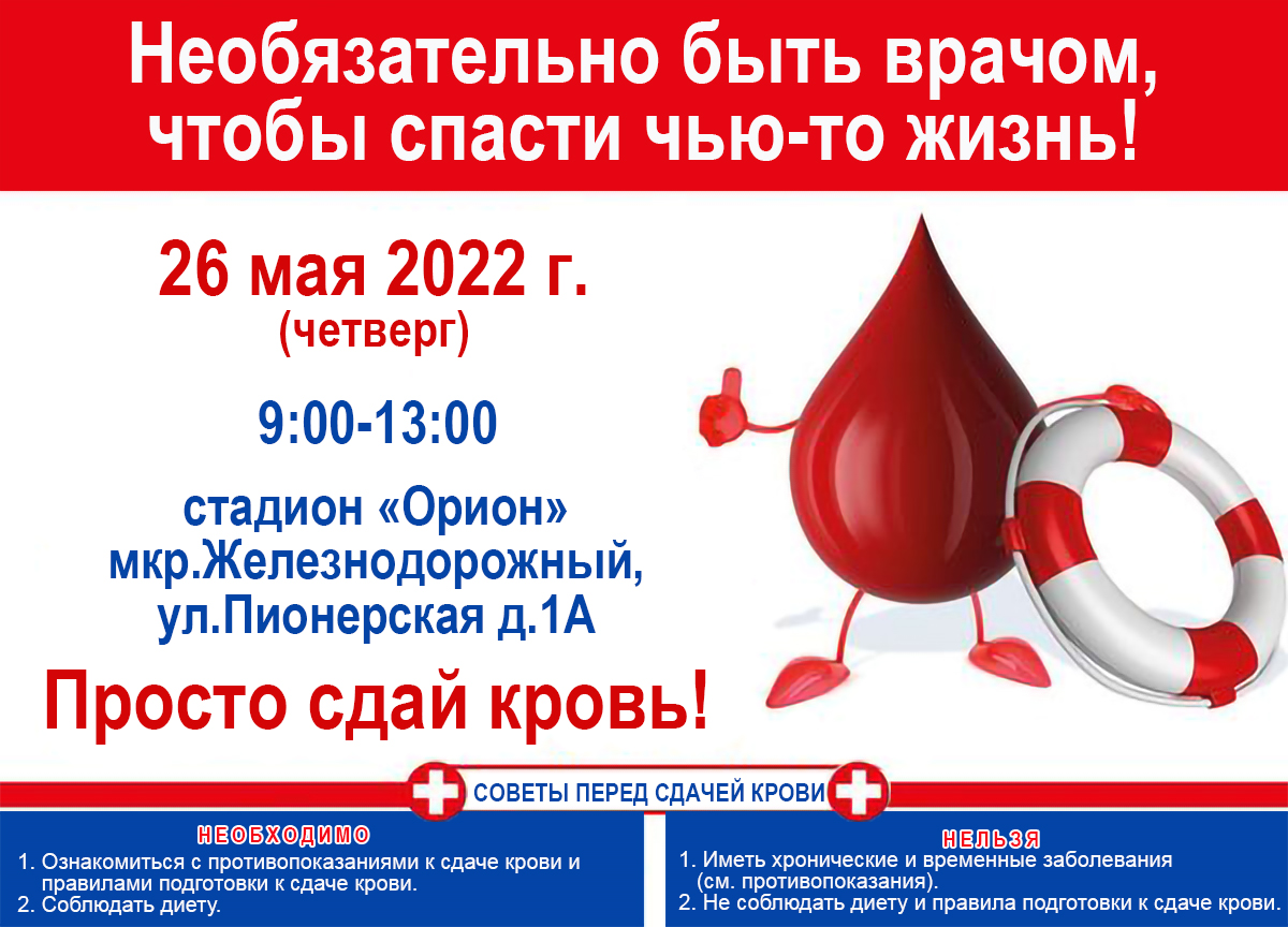 26 мая 2022 г. (четверг) с 09:00 до 13:00 на стадионе "Орион" пройдет Донорский день забора крови.
